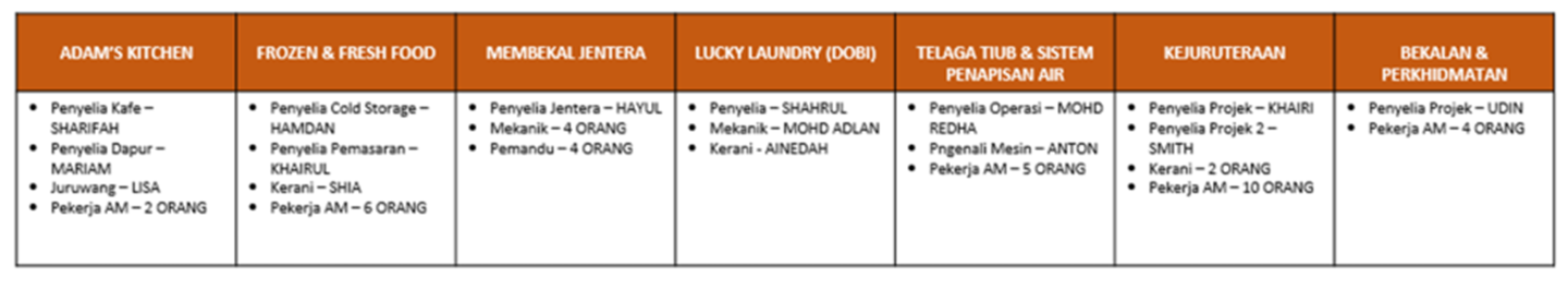 Perkhidmatan-perkhidmatan kami juga ialah membuat Telaga Tiub, Sistem Pembersihan Air, Sistem Penapisan Air, Kerja Kejuruteraan, Membekal Mesin Dobi, Membekal Jentera, Makanan Laut Sejuk Beku, Kafe & Katering serta membekal Ayam Frozen.